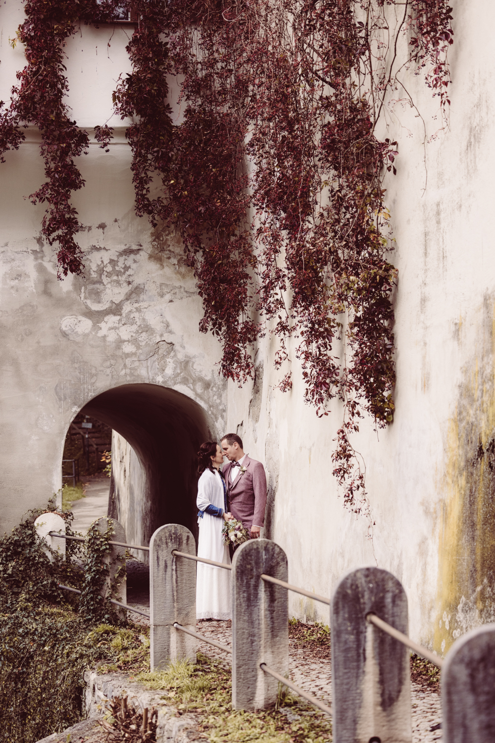 All das haben wir an diesem besonderen Hochzeitstag eingefangen. Das Brautpaar mit Kleid, farbigem Anzug und passenden Blumen fügte sich perfekt in die herbstliche Kulisse ein.