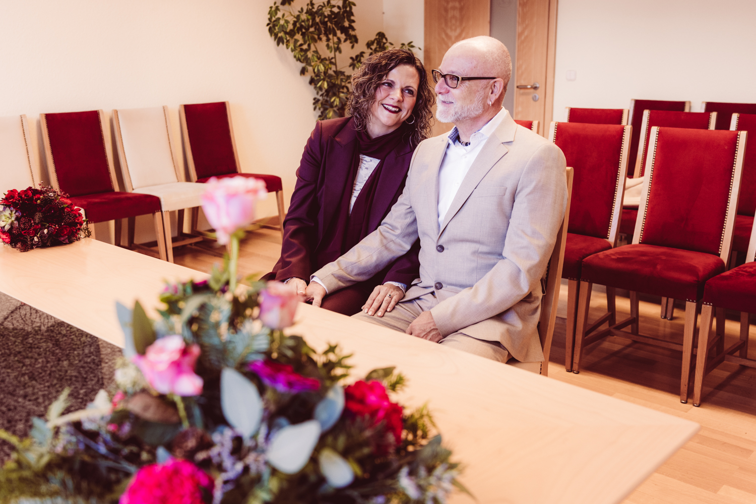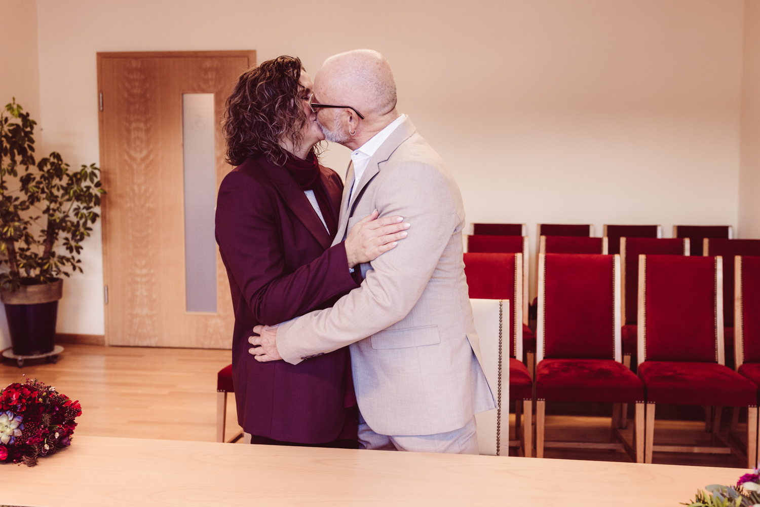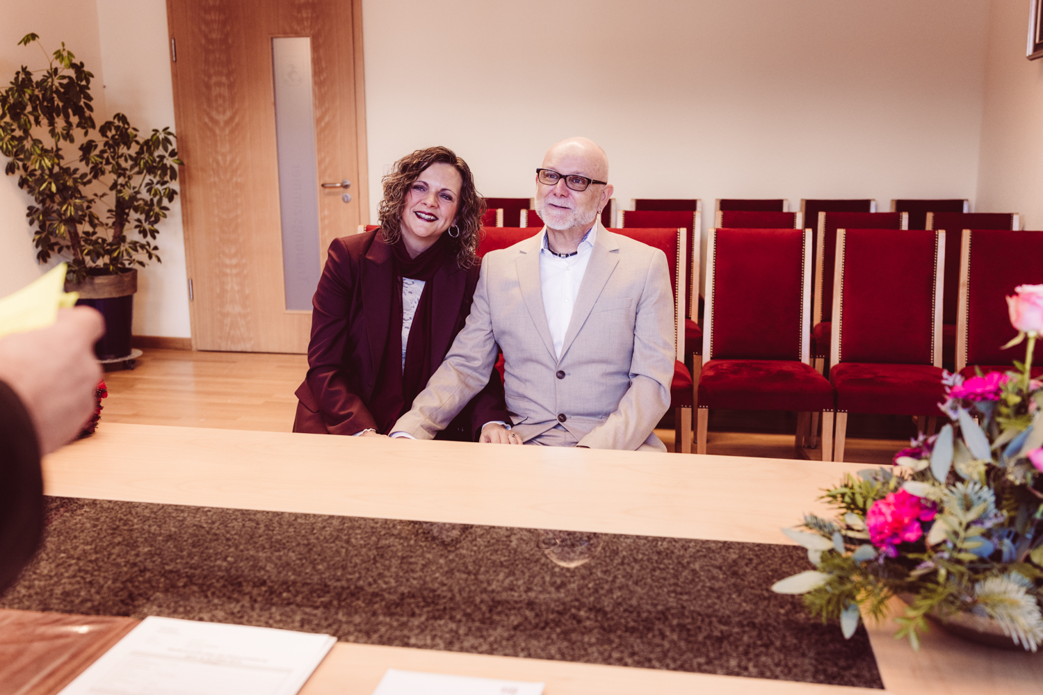 K + U kommen gut gelaunt an. Gemeinsam betreten wir das Gebäude, kurz darauf beginnt die standesamtliche Trauung.
