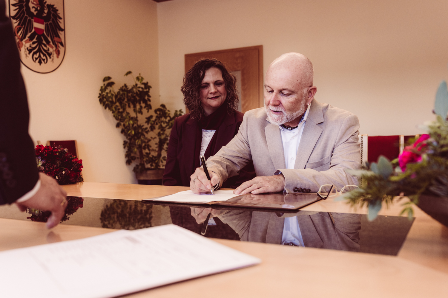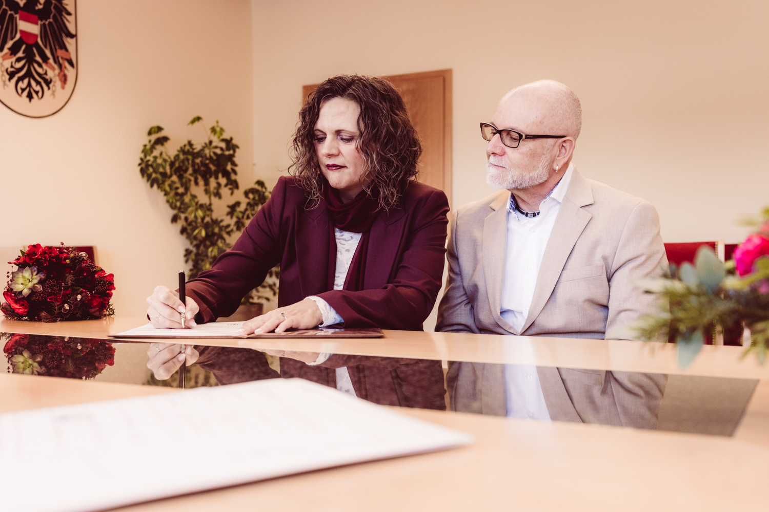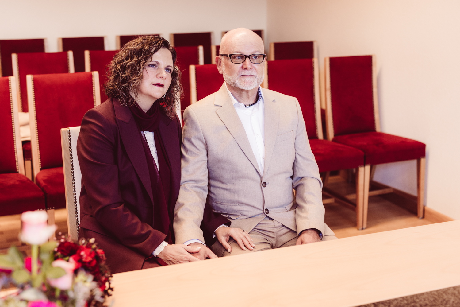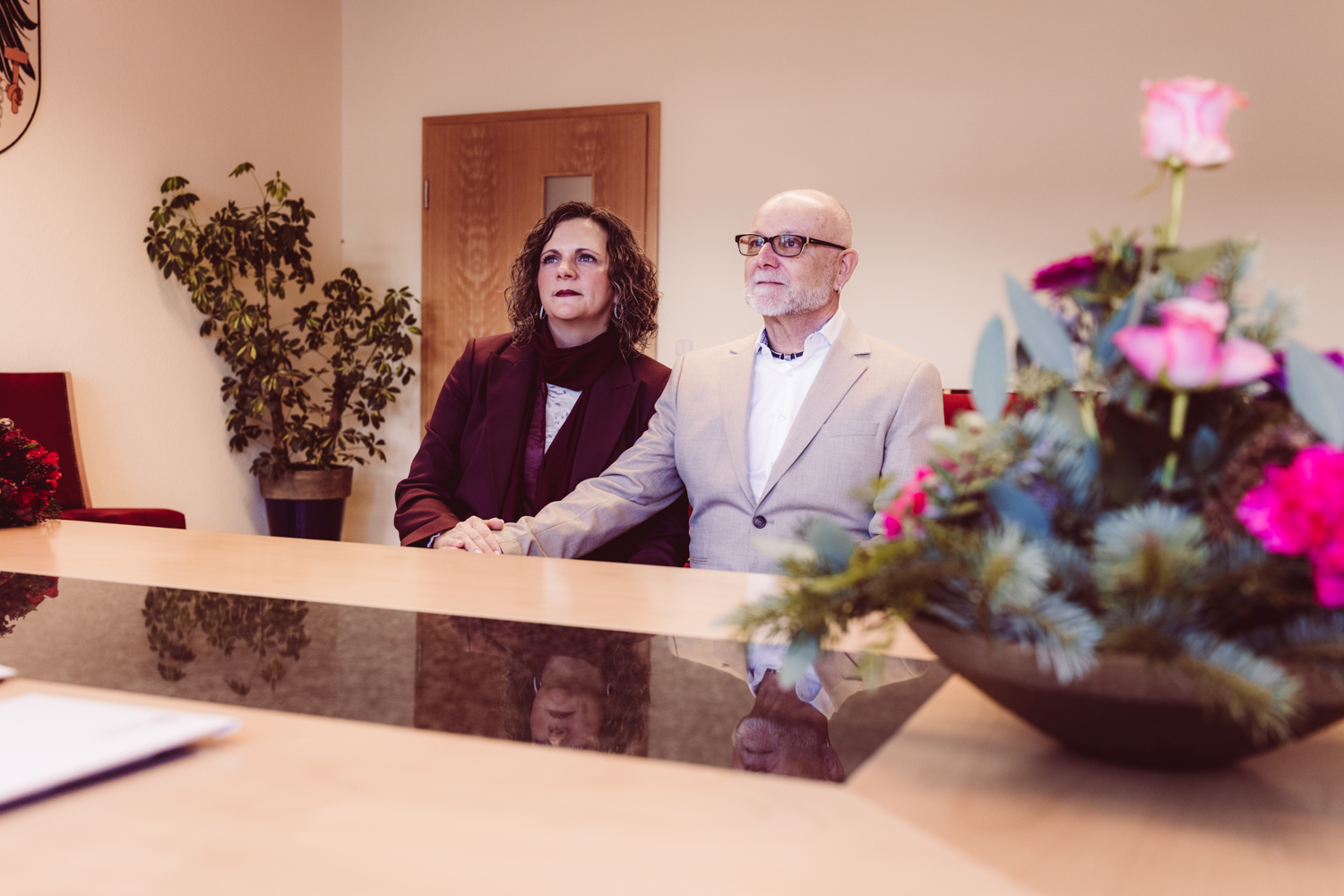 K + U kommen gut gelaunt an. Gemeinsam betreten wir das Gebäude, kurz darauf beginnt die standesamtliche Trauung.