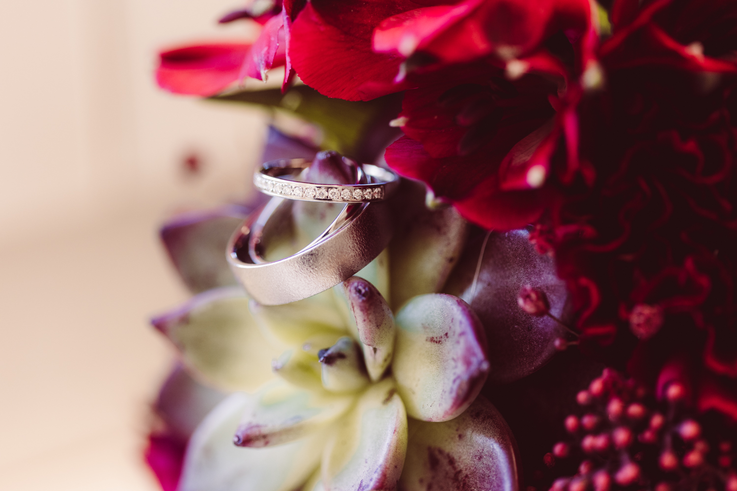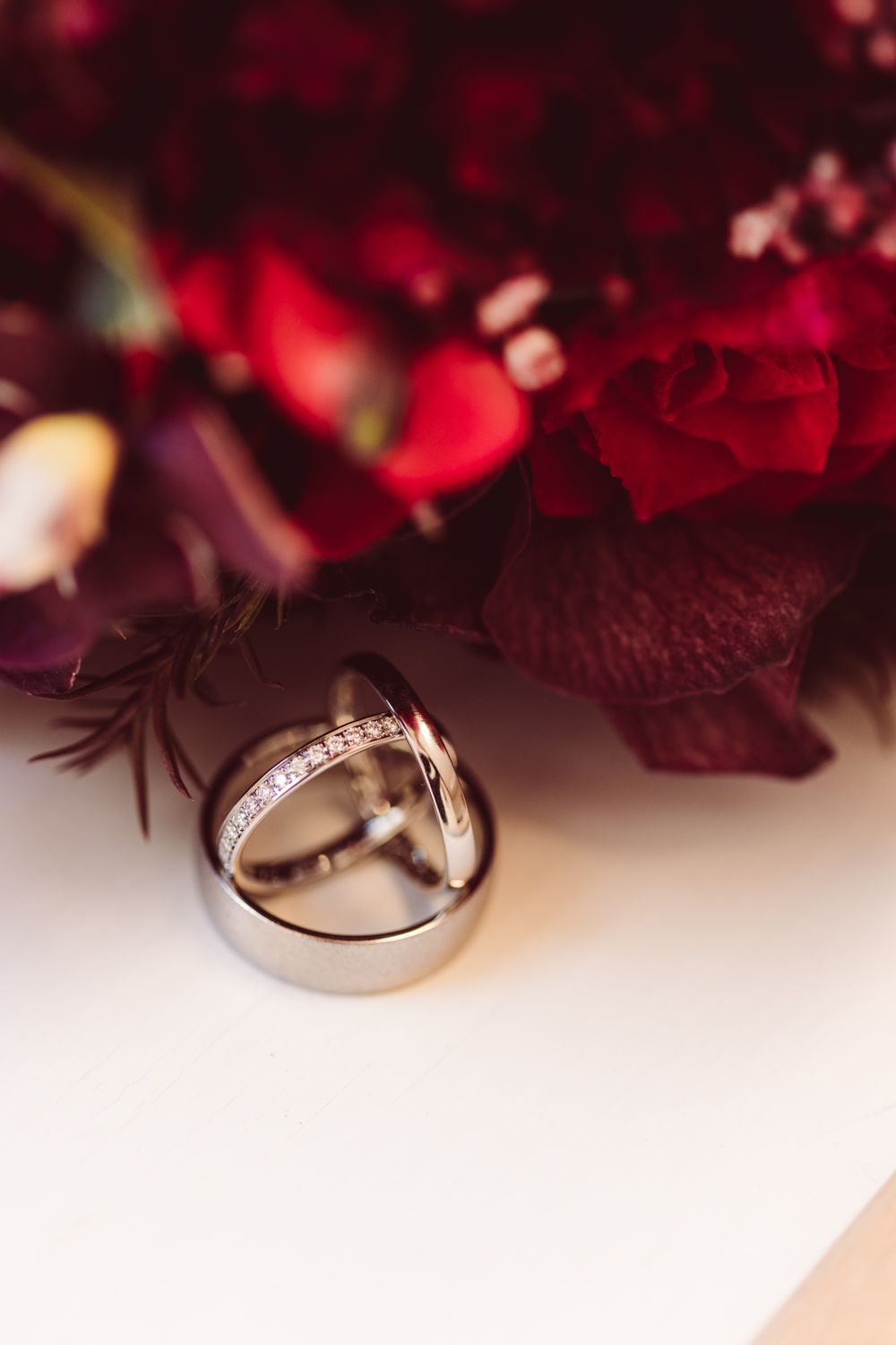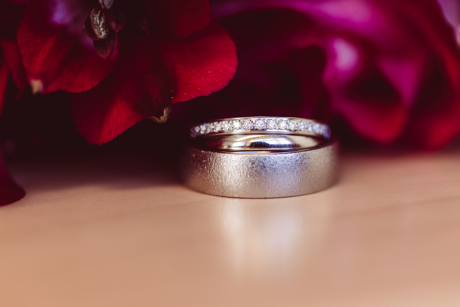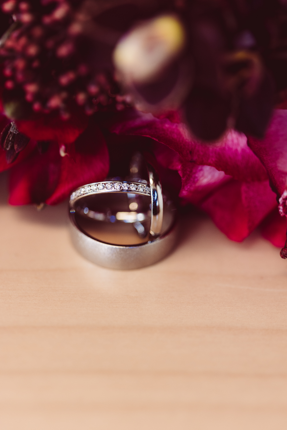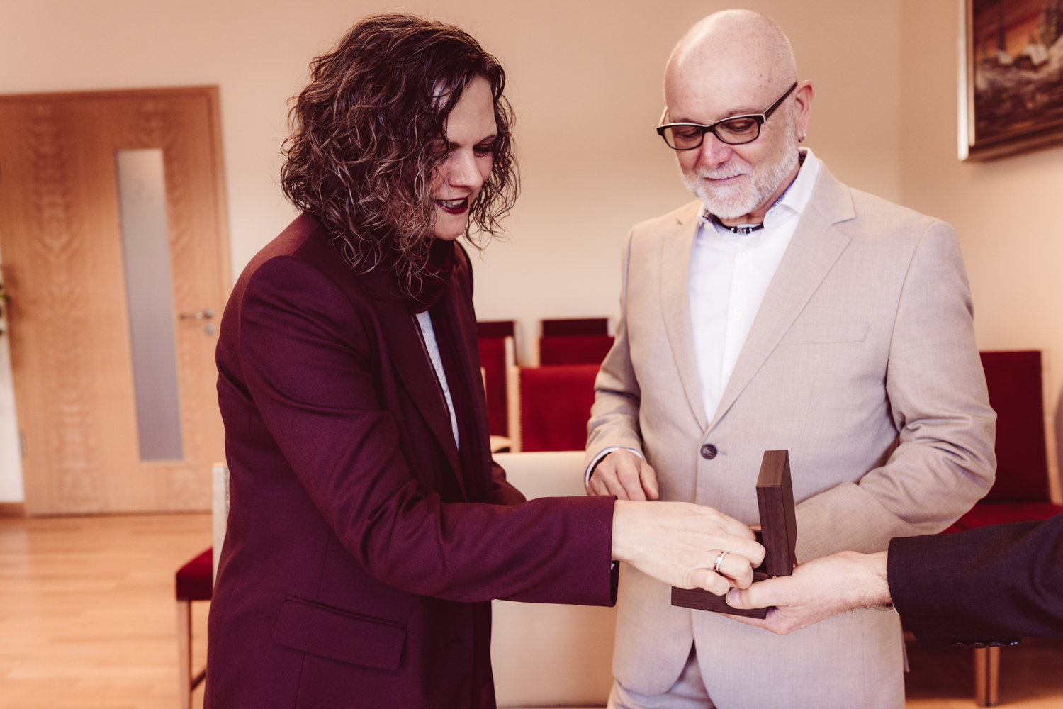 Der Standesbeamte baut persönliche Worte ein – immer wieder ein Moment, der berührt. Nach dem Ja-Wort stoßen sie mit Sekt an, ich nutze die Zeit, um die Ringe zu fotografieren. So können die beiden kurz durchatmen und einen Moment in Ruhe genießen.