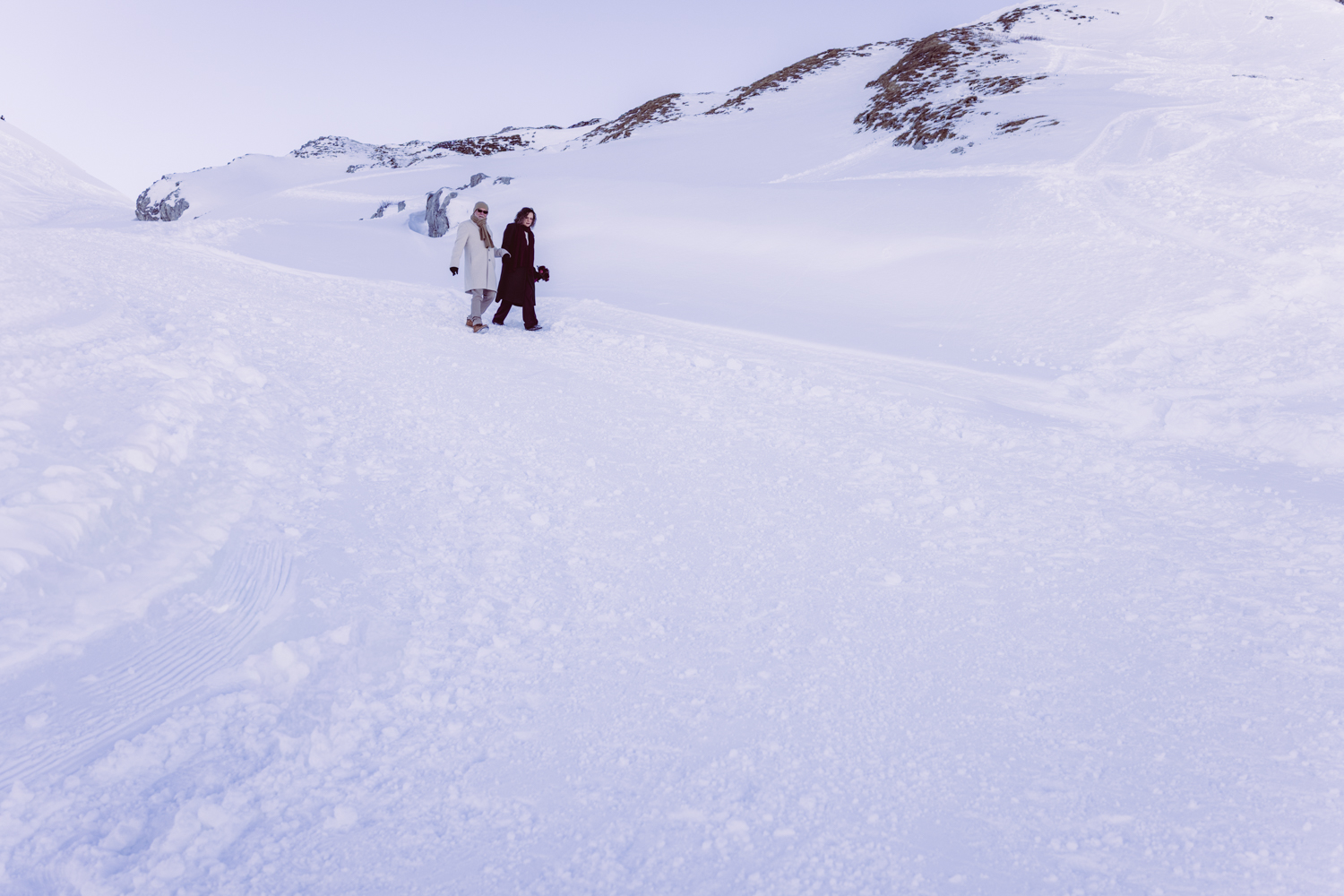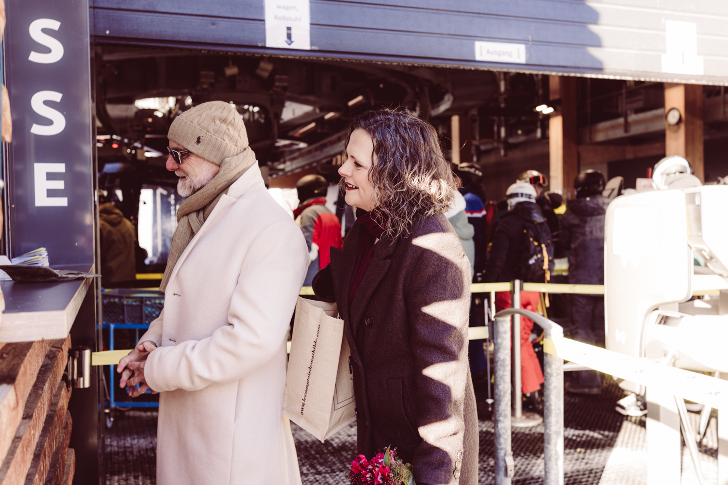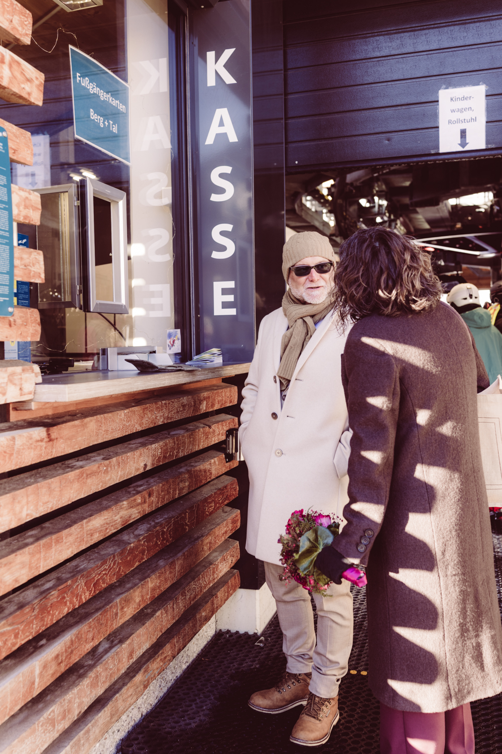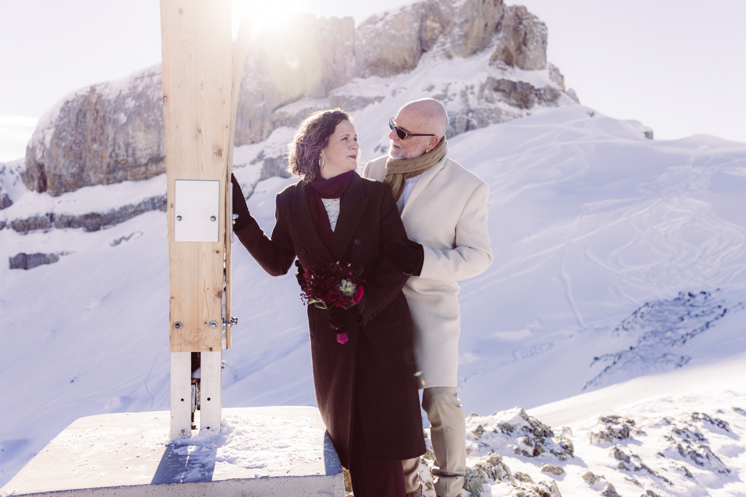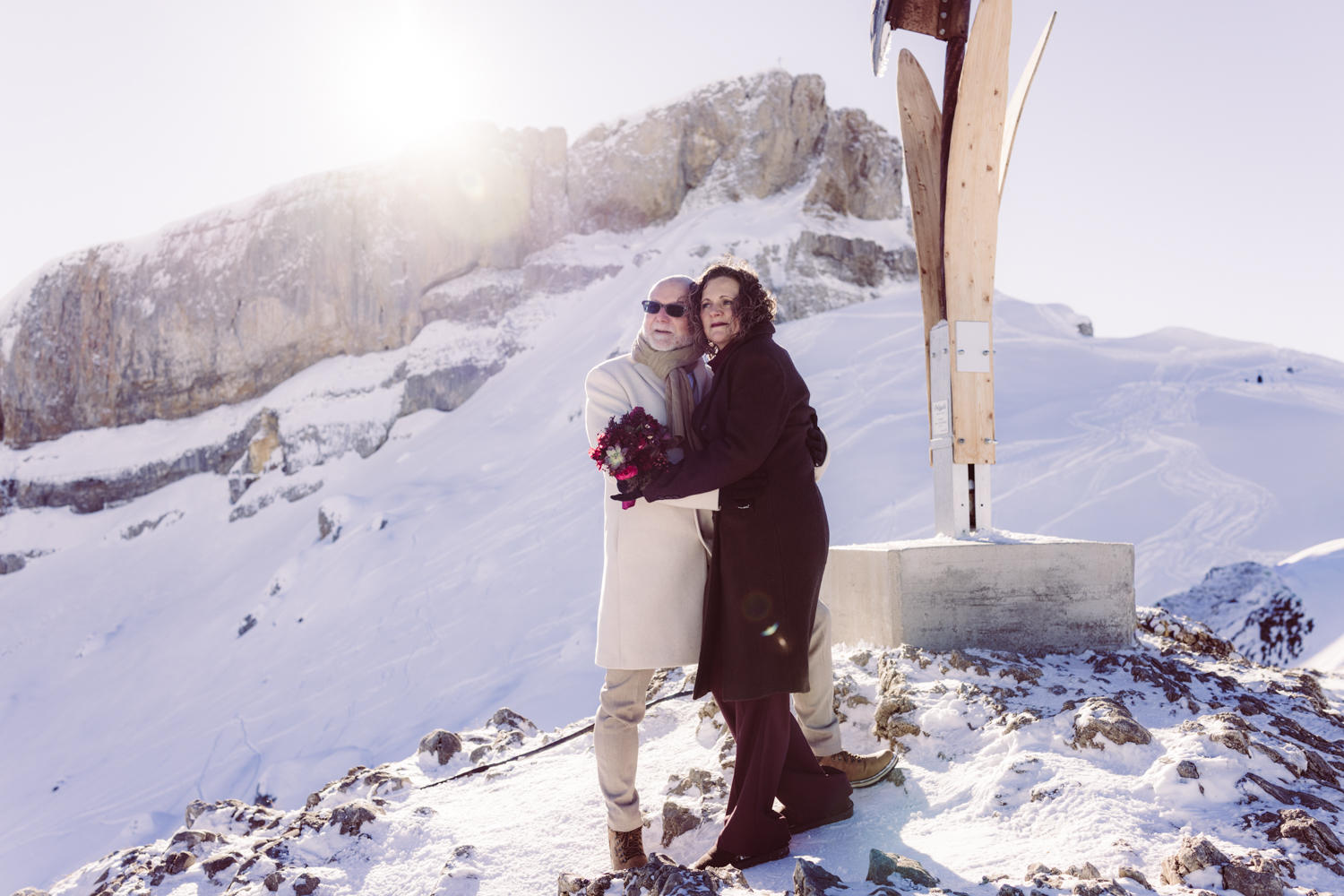 Trotz Wind und eisiger Temperaturen hält das Brautpaar unglaublich gut durch. Sogar ohne Jacken stellen sie sich ans Kreuz – mutig, entschlossen, ganz bei sich.