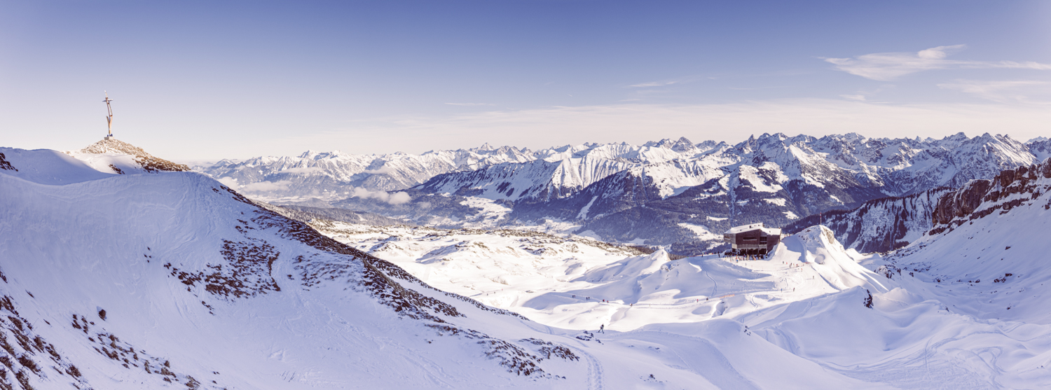Für einen kurzen Abstecher fahren wir zum Hotel Ifen Arosa. Vom großzügigen Balkon aus eröffnet sich ein weiter Blick auf den Widderstein – den Berg, der dem Bräutigam so viel bedeutet.