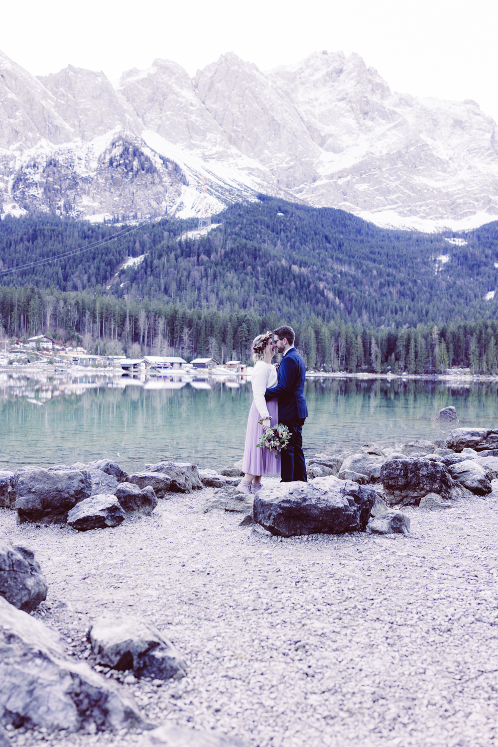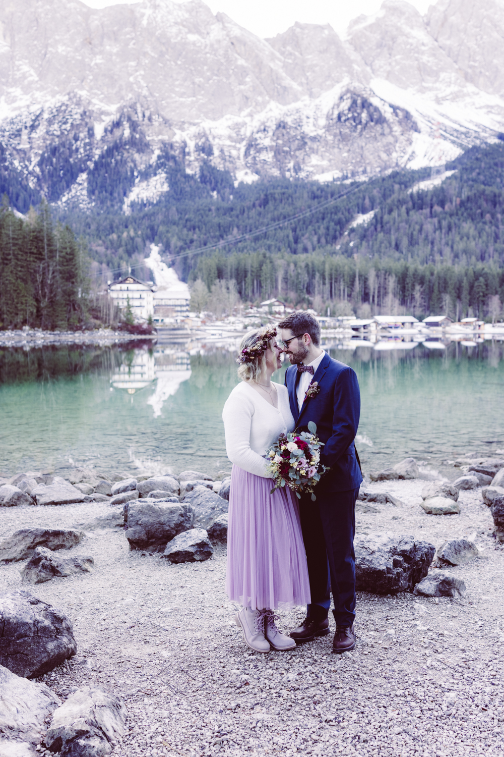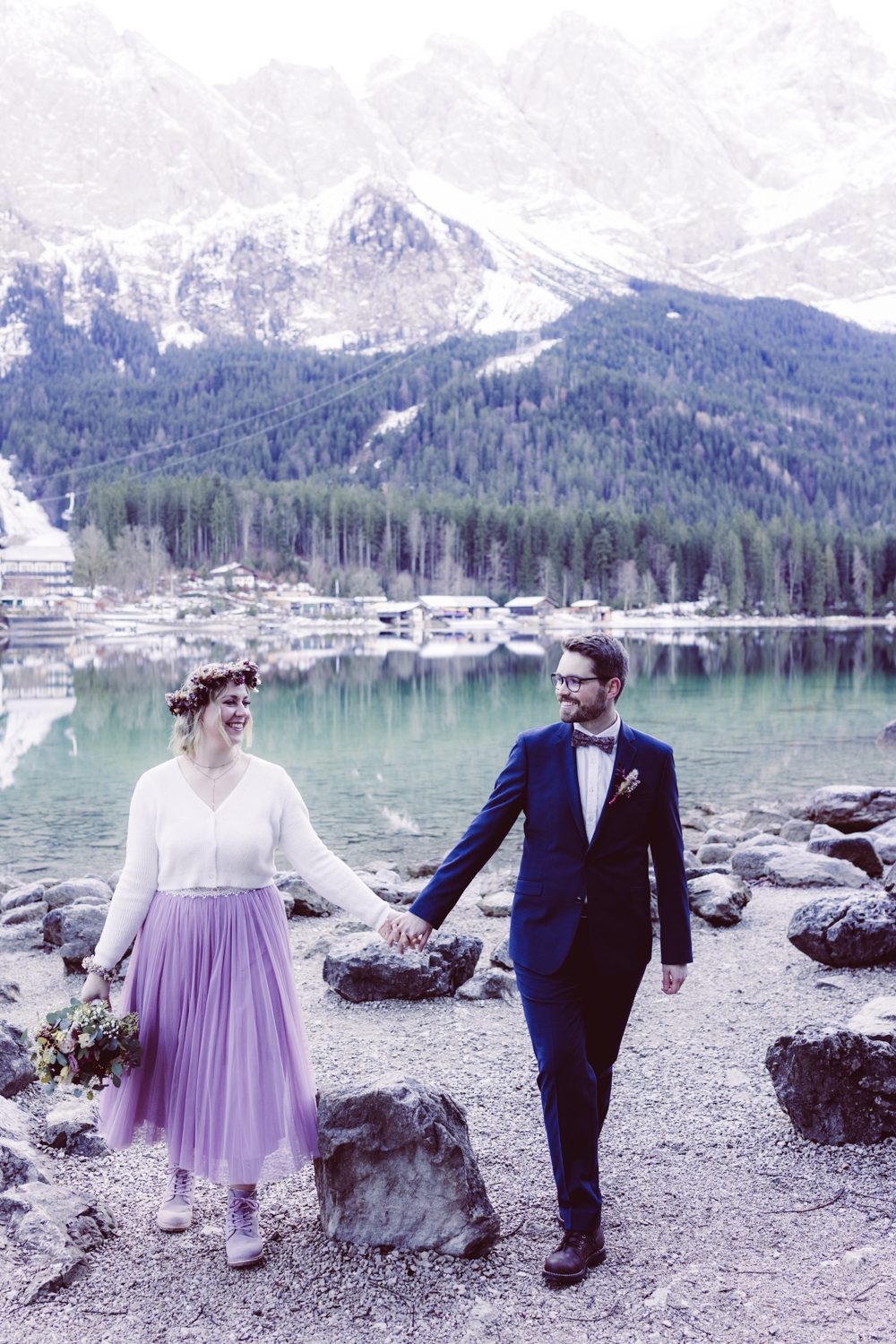 Start und Treffpunkt: Brautpaarshooting am Eibsee, mit kleinem Spaziergang, Blick auf die Zugspitze und felsiger Umgebung