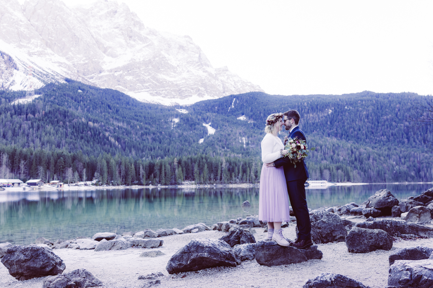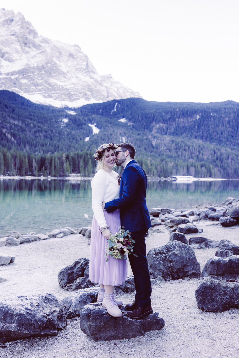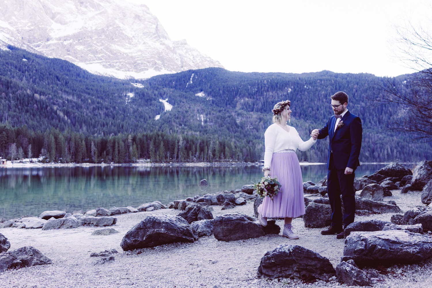 Start und Treffpunkt: Brautpaarshooting am Eibsee, mit kleinem Spaziergang, Blick auf die Zugspitze und felsiger Umgebung