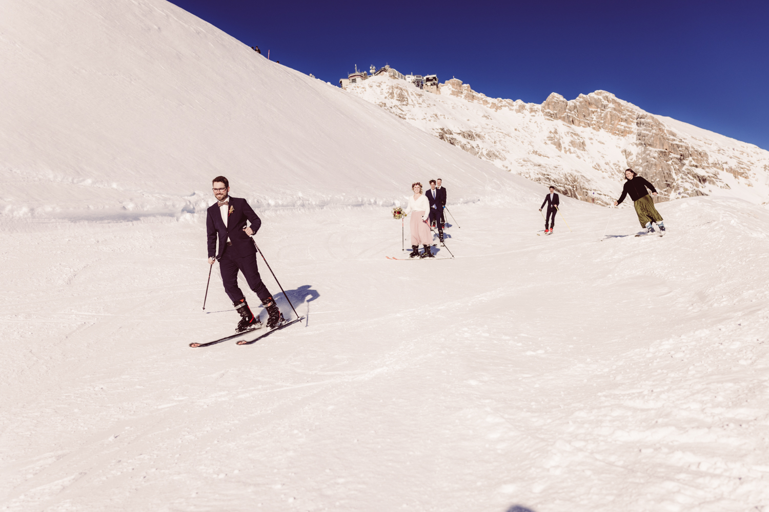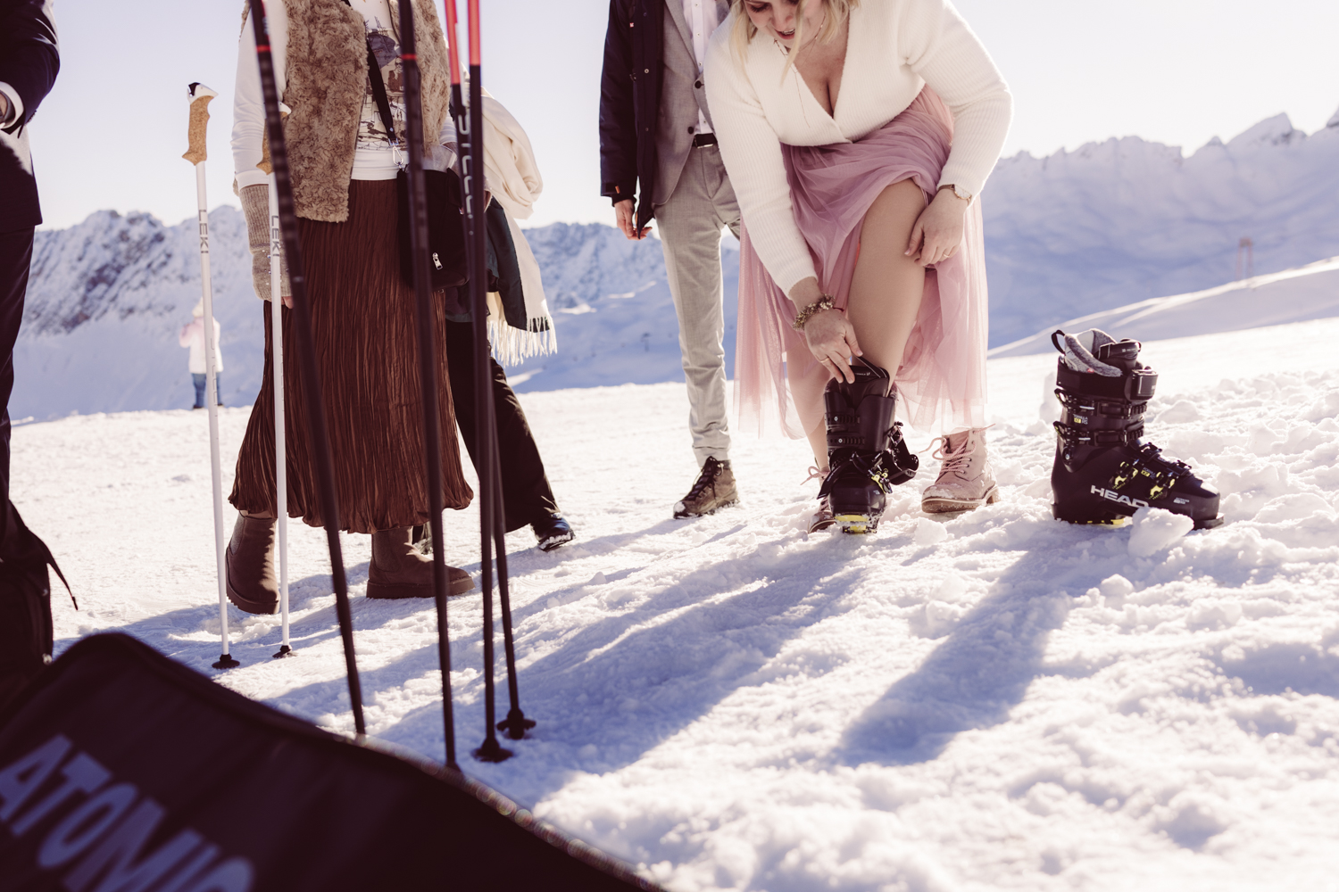 Jetzt wird es ein bisschen wuselig, denn das nächste Highlight steht an: das Brautpaar und die Geschwister ziehen ihre Skischuhe und Ski an, denn die Skiabfahrt steht an.