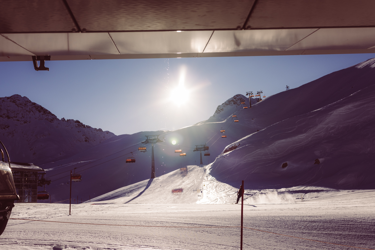 Bei der Abfahrt halten wir zwei Mal am Rand der Piste an und fangen nochmal das schöne Sonnenlicht mit ein.