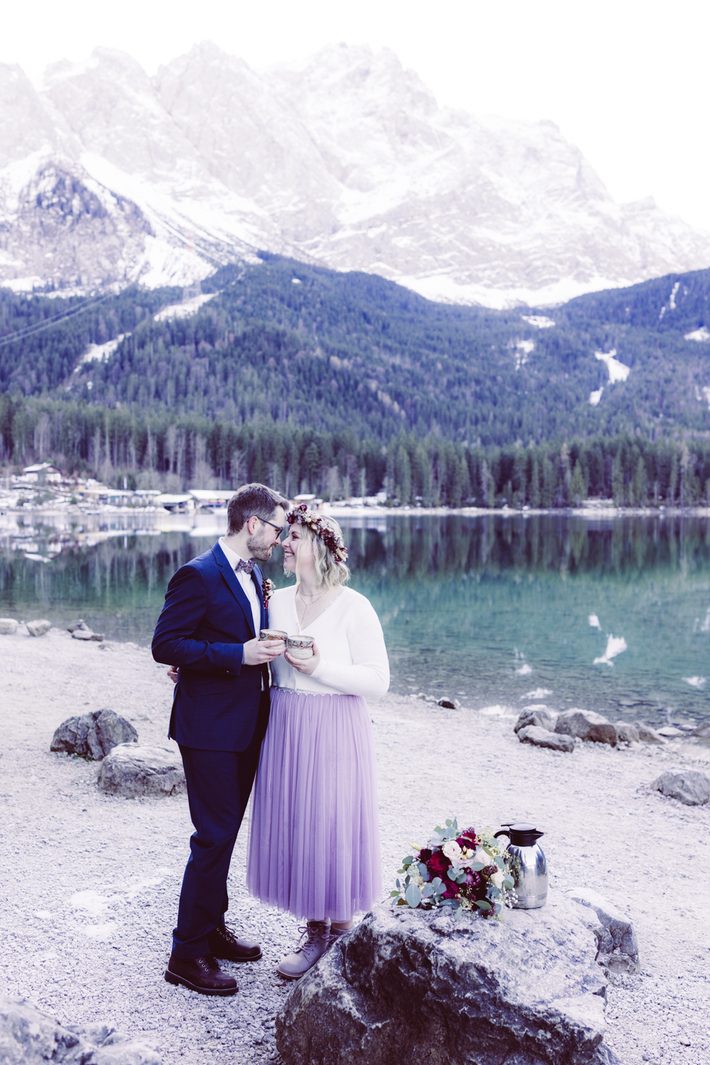 Standesamtliche Trauung im kleinen Kreis und abenteuerliches, abwechslungsreiches Brautpaarshooting am Eibsee und auf der Zugspitze, mit Fotobegleitung der ersten Skiabfahrt als Ehepaar