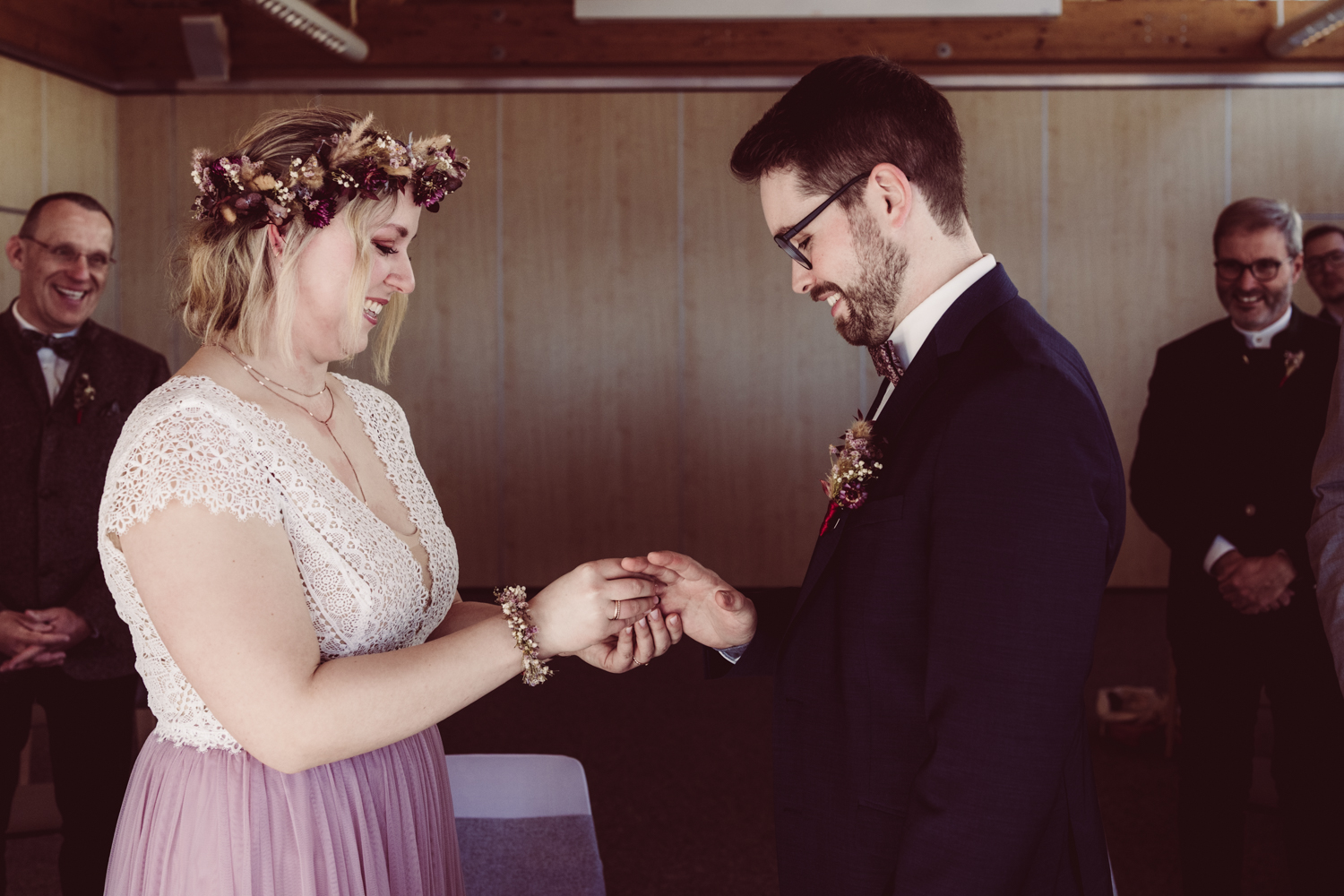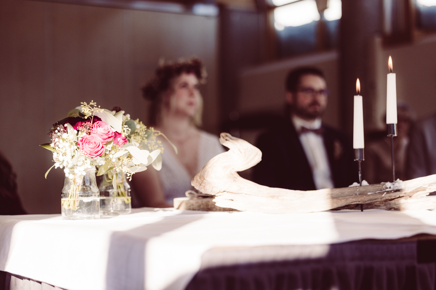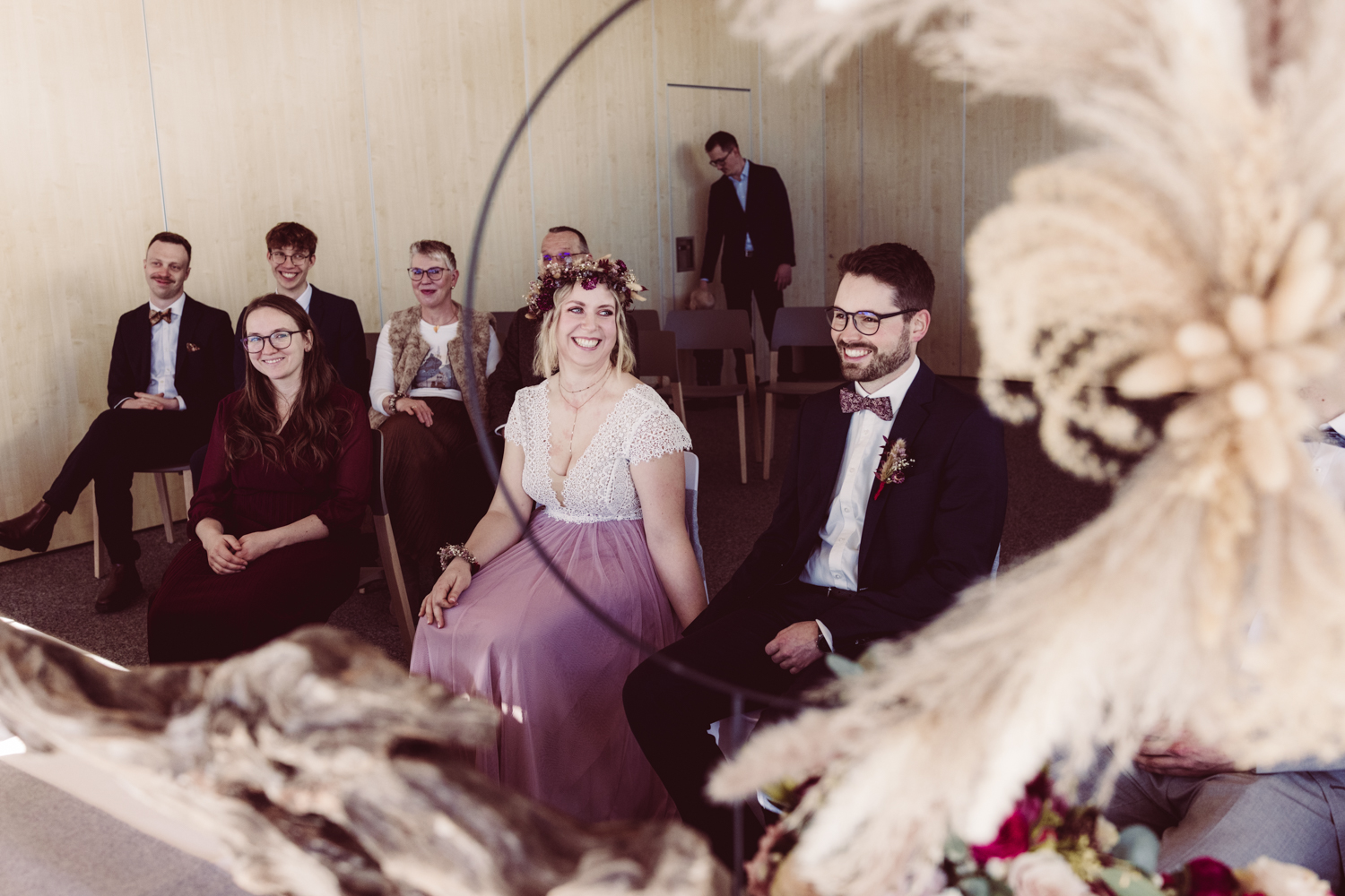 Die Familien kommen im Vorraum an und packen alles wichtige für die Trauung aus: Blumen, Deko, die Ringe, die gravierte Holzscheibe für die Ringe. Dann nehmen alle Platz, das Brautpaar kommt herein und emotionale Trauung kann beginnen.