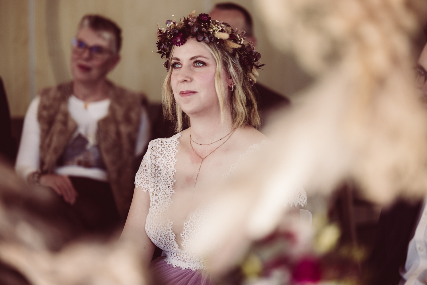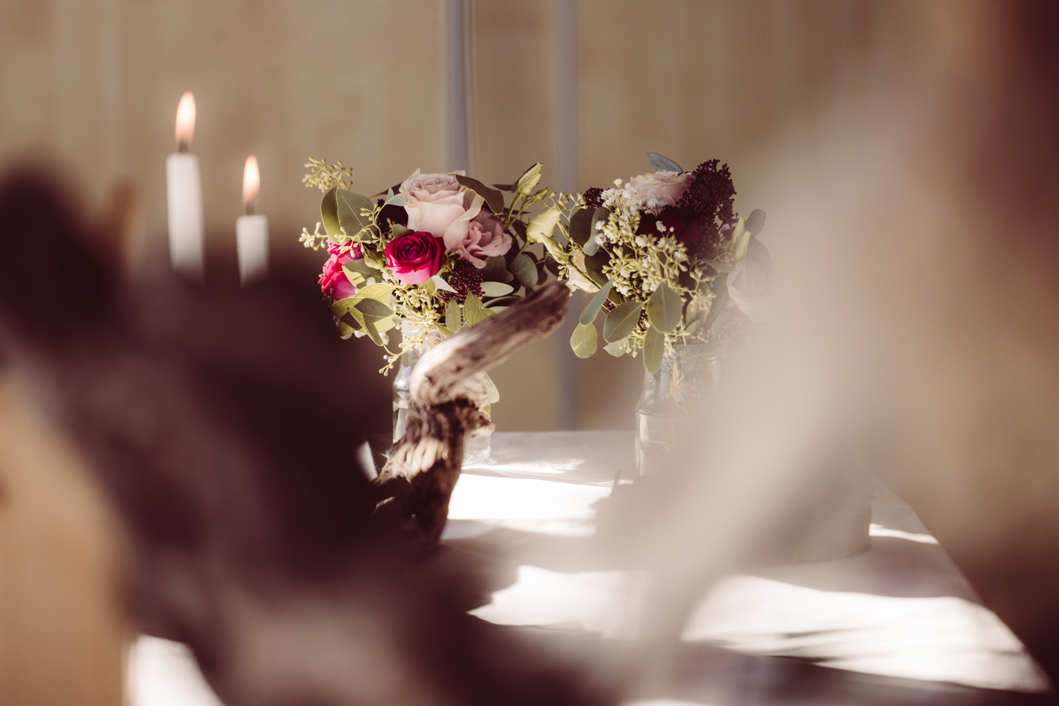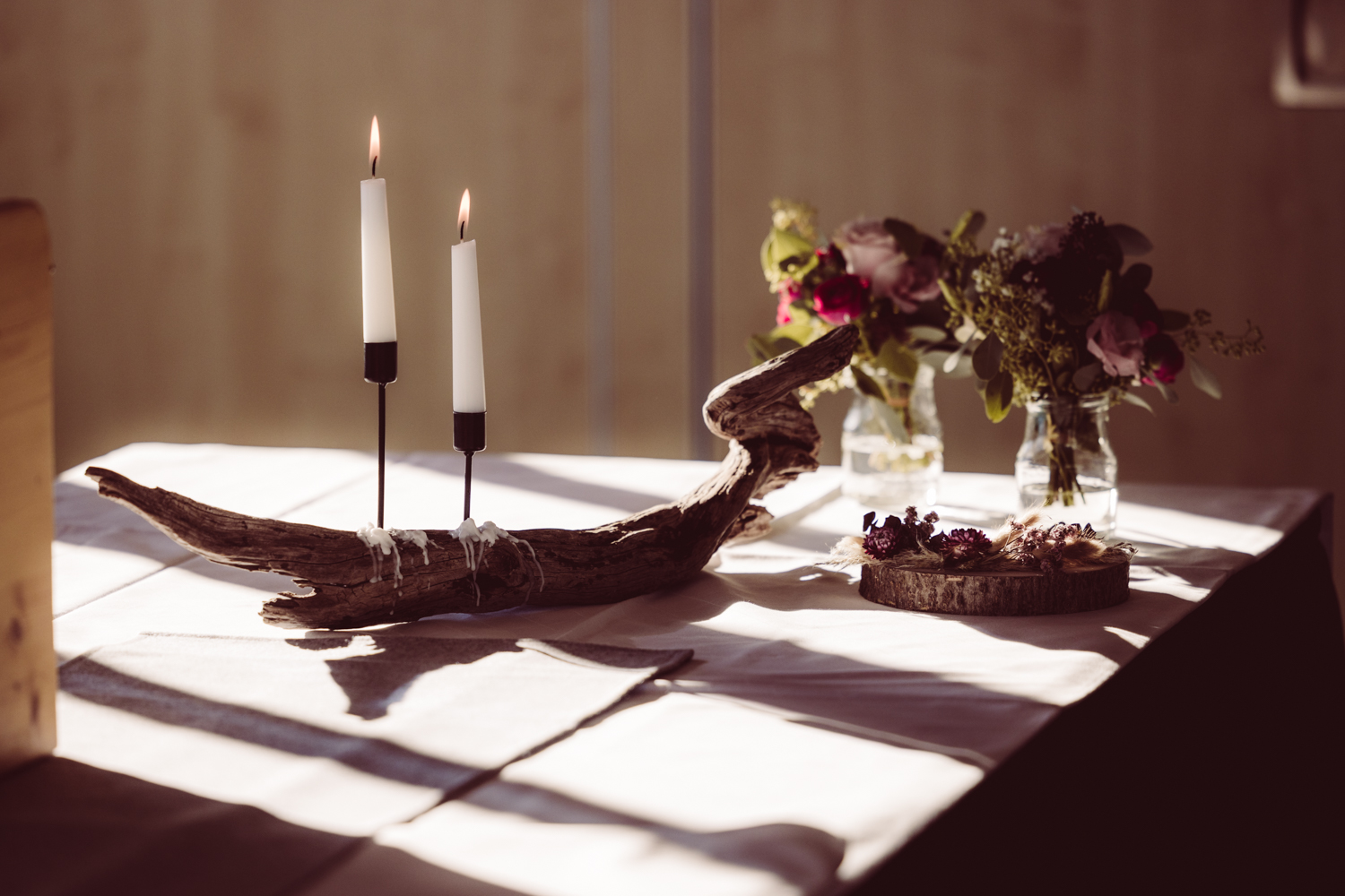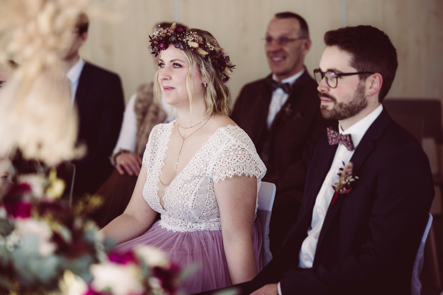 Die Familien kommen im Vorraum an und packen alles wichtige für die Trauung aus: Blumen, Deko, die Ringe, die gravierte Holzscheibe für die Ringe. Dann nehmen alle Platz, das Brautpaar kommt herein und emotionale Trauung kann beginnen.