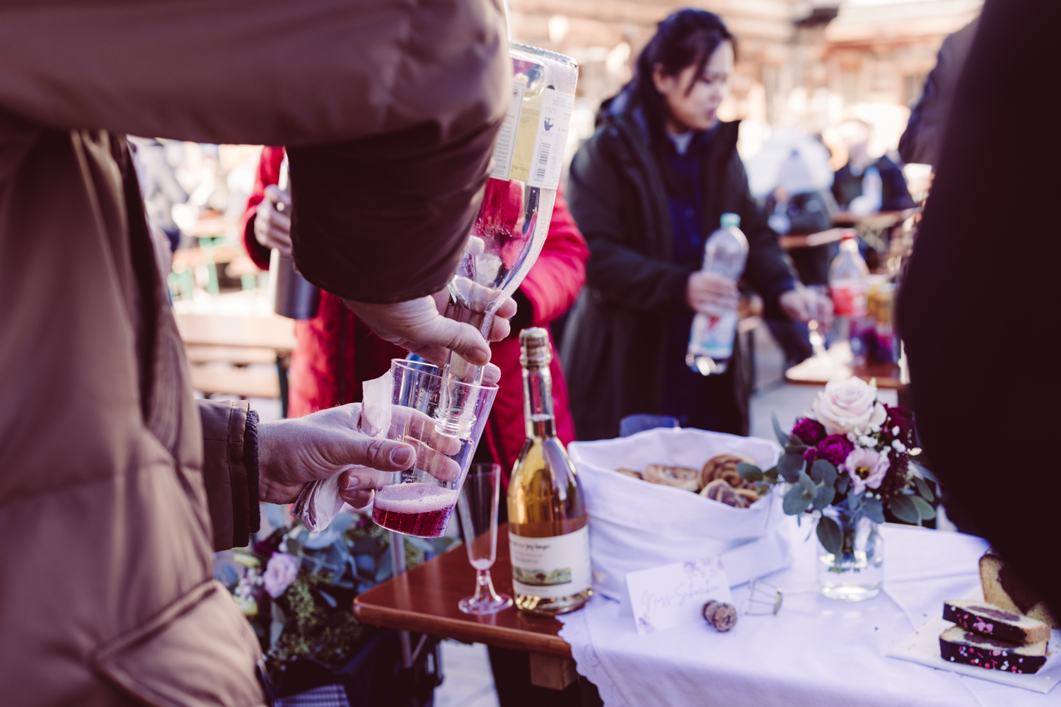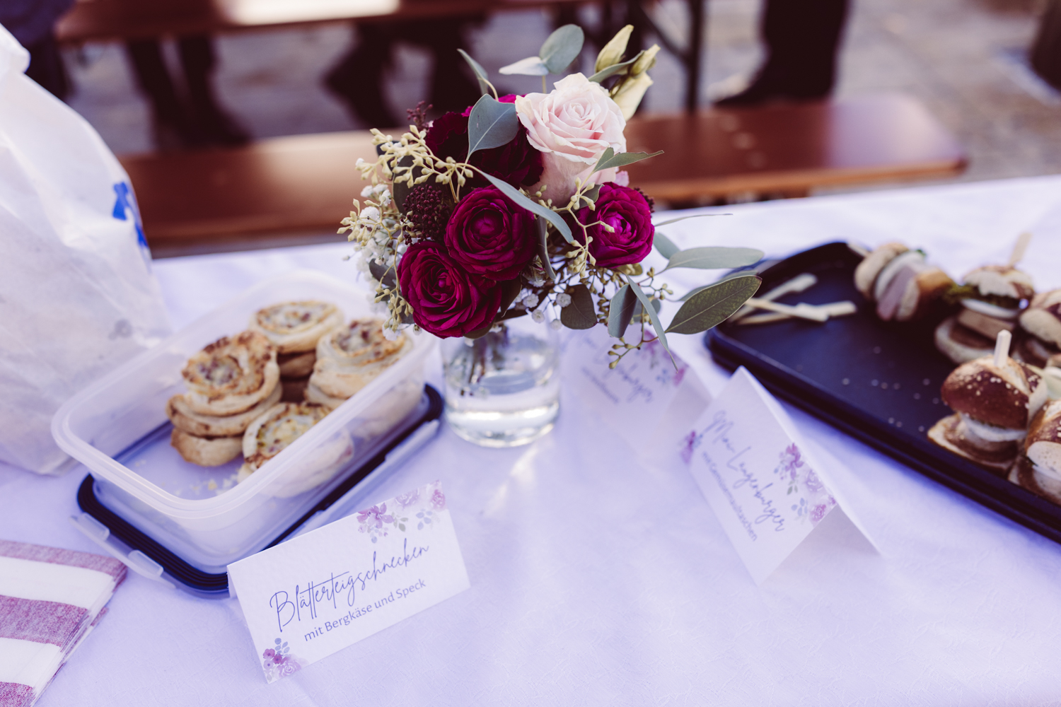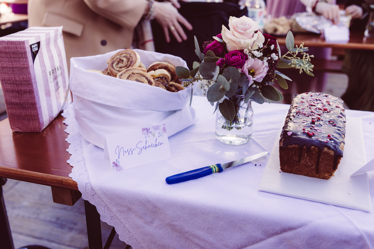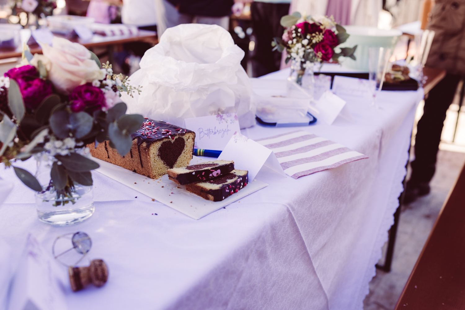 An den Biertischen und -bänken findet der Sektempfang statt, mit verschiedenen Getränken und selbst mitgebrachtem Fingerfood. Sogar ein Herz-Rührkuchen ist dabei, den Lea und Marcus anschneiden.