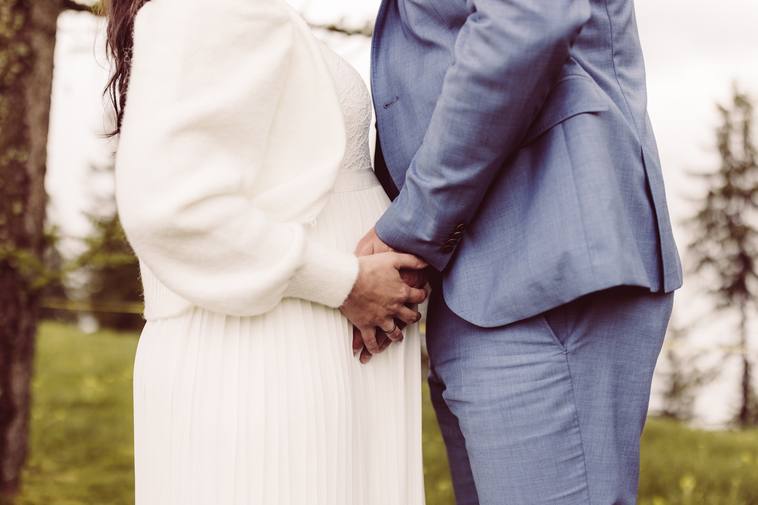 Bei der zweiten Runde der Portraits haben Jasmin und Frank ein bisschen Zeit zu zweit, wir fotografieren mit Bergblick und Nebel und alles sieht so friedlich und traumhaft aus.